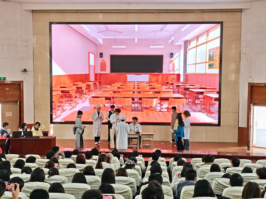 闭幕式上,学生们自编自导了一部名为“时空答题卡”的话剧。该剧以高超同学的一场梦境为开端,梦中的他未能珍惜时间,面对难题时显得束手无策。梦醒之后,他幡然醒悟,开始合理规划学习时间,奋发图强。剧中通过夸张的肢体动作和幽默风趣的对白,引发了观众们的强烈共鸣,为闭幕式注入了青春活力与艺术感染力。