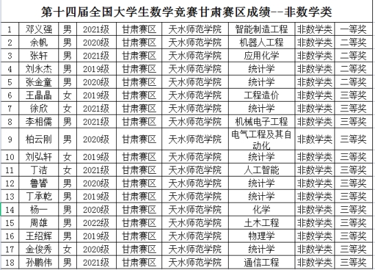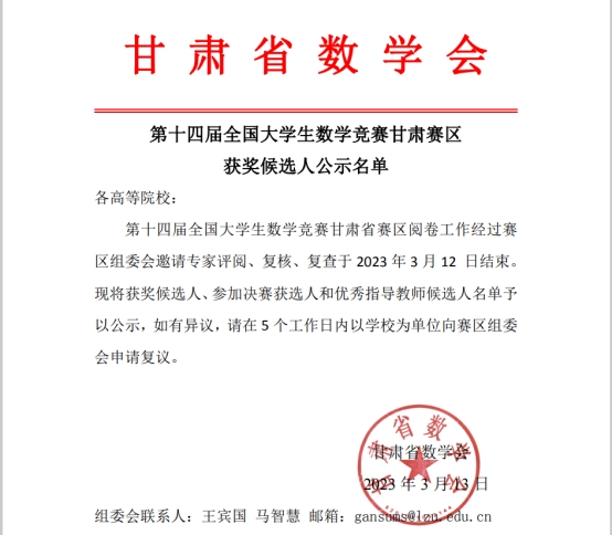 由中国数学会主办的2023年第十四届全国大学生数学竞赛(甘肃赛区)获奖名单近日揭晓。PP电子有62名同学喜获佳绩。数学专业B组获奖44项,其中一等奖6项,二等奖19项,三等奖19项;非数学专业获一等奖1项,二等奖4项,三等奖13项,共18项。数统学院2019级学生钱崇姣获数学专业B组第三名,机电学院2021级学生邓义强获非数学专业第7名,两人将代表甘肃赛区参加全国大学生数学竞赛决赛。