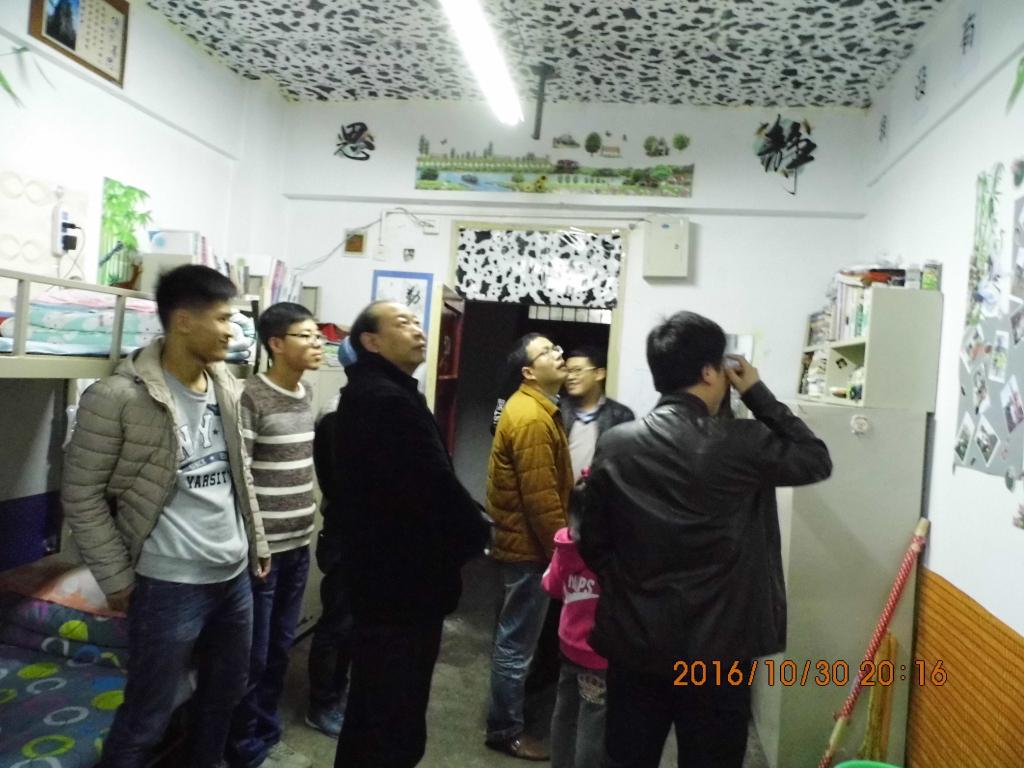 为了加强学生宿舍管理,规范学生行为,提高大学生精神风貌,我院积极响应学校“五星级文明宿舍”活动的号召,PP电子游戏网站于2016年10月30日晚7:30进行了“星级文明宿舍”检查活动。在我院党总支书记吴树雄、院长王三福、副书记崔德旺、副院长马维学、副院长谢保利的带领下,辅导员、各班班主任以及部分学生会人员深入博学、云帆公寓我院学生宿舍,对我院学生“星级文明宿舍”活动的创建情况进行了检查。本次检查以宿舍卫生、宿舍安全、宿舍主题和宿舍文化氛围建设为重点,分两组对男生宿舍和女生宿舍进行了检查。