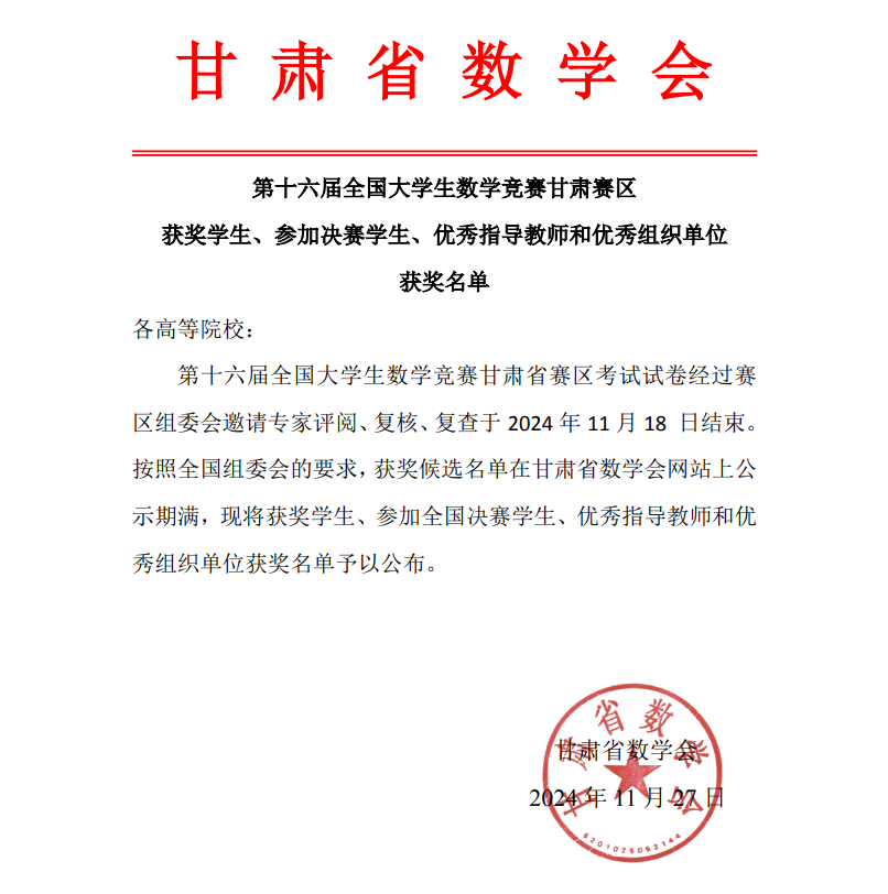 由中国数学会主办的2024年第十六届全国大学生数学竞赛(甘肃赛区)获奖名单近日揭晓。PP电子有101名同学喜获佳绩。数学专业B组获奖63项(其中一等奖16项,二等奖19项, 三等奖33项),非数学专业A组获奖33项(其中一等奖2项, 二等奖14项, 三等奖17项),数统学院2022级学生章惠娟进入全国决赛,PP电子获优秀组织奖。